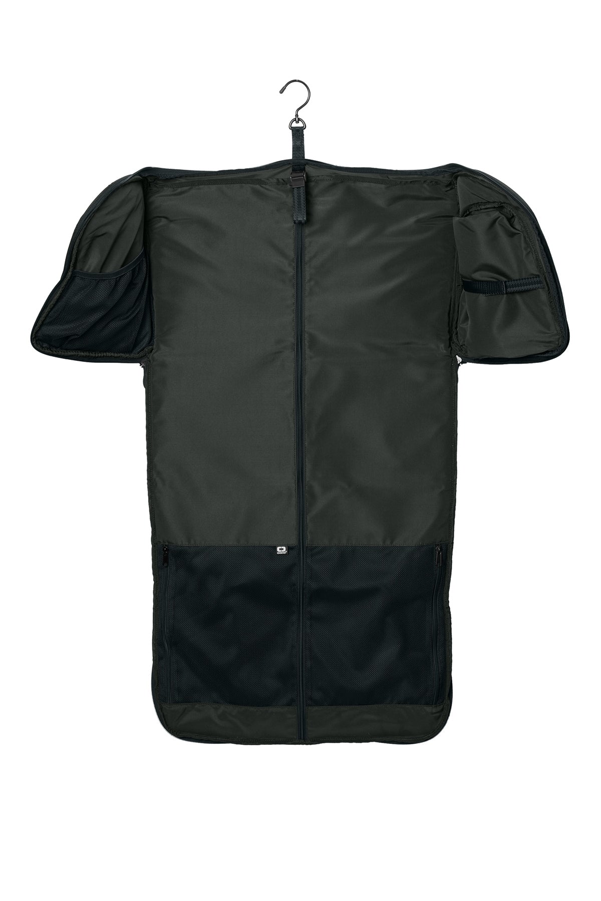 - When completely unzipped, garments hang neatly in main compartment